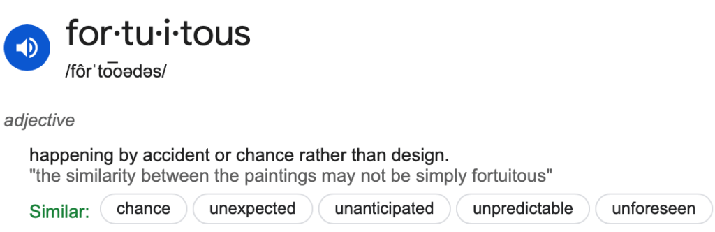 Naturally, this made me wonder why I needed to move to a new place to grow. I’m not entirely sure, but perhaps the name of my blog has something to do with it: Fortuitous Purpose. The term “fortuitous” refers to something happening by chance, and my blog name suggests it happens with a sense of purpose. At one point, I tried to control the outcome of my life, but fate always seemed to push me in a different direction.